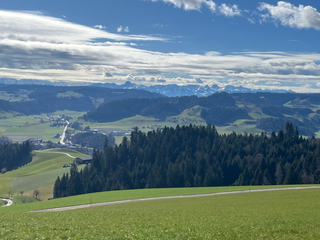 Nach einem etwas steilen Aufstieg zur ersten Egg, zur Krete bei Linden geniessen wir ab hier eine aussichtsreiche Höhenwanderung mit Blick sowohl in den Jura wie auf die Berner Alpen und die vielen «Höger» des Emmentals. Über die Almisbergegg und Rachisberg gelangen wir zum Gehöft Schallenberg, wo bereits ein wiederum recht steiler Abstieg nach Rüegsauschachen beginnt.